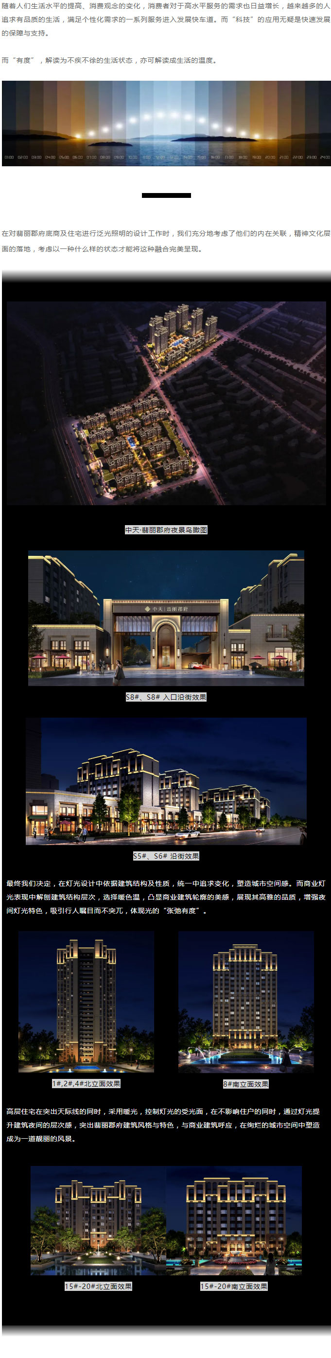 2.住宅的開放式創(chuàng)新照明設(shè)計(jì):創(chuàng)新是照明景觀藝術(shù)的靈魂。它不僅包括創(chuàng)新思想的創(chuàng)新,還包括技術(shù)手段的創(chuàng)新。積極運(yùn)用新技術(shù)、新光源和新材料,特別是高新技術(shù)的應(yīng)用。改善景觀照明設(shè)施的技術(shù)。 XUPIN BENSE 關(guān)于本案—中天·翡麗郡府泛光照明設(shè)計(jì) 中天美好集團(tuán)2021年度品牌主題煥新發(fā)布 #智薈科技有度生活。“房地產(chǎn)與科技主題應(yīng)用”的CP在業(yè)內(nèi)并不罕見,像是綠城的5G社區(qū),金茂的科技系統(tǒng),還有朗詩的綠色科技等等。 但用科技貫穿于項(xiàng)目全周期的房企,中天美好集團(tuán)還是頭一批——“智”是品牌主題的內(nèi)核,由此延伸出了智慧建造MCT2.0、智美社區(qū)和智享家居三大模塊。 適逢中天·翡麗郡府建設(shè)方提出照明設(shè)計(jì)意向,我們發(fā)現(xiàn)沒有比中天美好集團(tuán)的2021新品牌主題“智薈科技有度生活”更契合的泛光照明設(shè)計(jì)主題了。