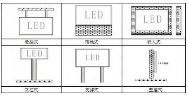 LED顯示屏根據(jù)用戶使用環(huán)境不同,安裝方式有:壁掛式、懸臂式、鑲嵌式、立柱式、站立式、樓頂式、移動式、球場圍欄式、租賃吊裝式、弧形式等多種安裝方式。