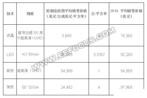 盡管在過去兩年間小間距LED屏的價格已經(jīng)大幅下降(從每平米7萬美元左右降至約3萬美元),但價格差仍然較為顯著。以下是基于標(biāo)準(zhǔn)55英寸超窄邊框液晶視頻墻的不同顯示技術(shù)平均銷售價格對比: