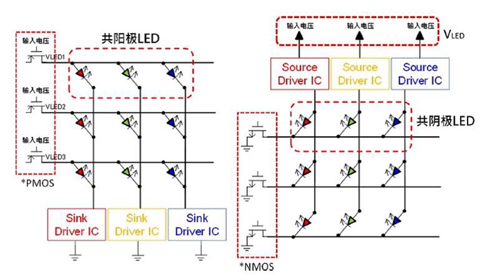 ♦ 圖2:共陽驅(qū)動與共陰驅(qū)動掃描屏電路架構(gòu)比較