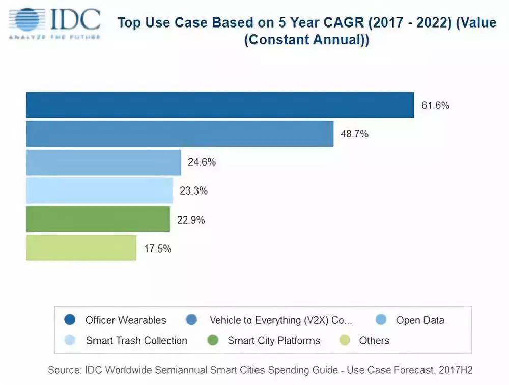 可以這樣說(shuō),IDC最新版本的全球智能城市支出指南的發(fā)布,是人們了解全球城市正在進(jìn)行何種轉(zhuǎn)變的重大進(jìn)展。IDC客戶洞察與分析小組的項(xiàng)目經(jīng)理Serena Da Rold表示:“在城市的支出方面,智能交通和數(shù)據(jù)驅(qū)動(dòng)的公共安全仍是智慧城市最大的投資領(lǐng)域。與此同時(shí),與后臺(tái)和平臺(tái)相關(guān)領(lǐng)域的支出也在不斷增長(zhǎng)?!眻?bào)告顯示,在支出方面,固定視頻監(jiān)控、智能交通和智能戶外照明這三大領(lǐng)域?qū)⒄紦?jù)2018年全球智慧城市技術(shù)支出的四分之一。而到2022年,智能交通管理方面的支出將超越排名第三位的智能戶外照明,三者在智慧城市技術(shù)總支出的比例將縮減至五分之一,這是因?yàn)槠渌⌒皖I(lǐng)域的支出正在不斷增長(zhǎng),特別是官方可穿戴設(shè)備(Fitbit/智能眼鏡)和車聯(lián)網(wǎng)(V2X)連接性,這兩大領(lǐng)域的支出增長(zhǎng)速度最快。
