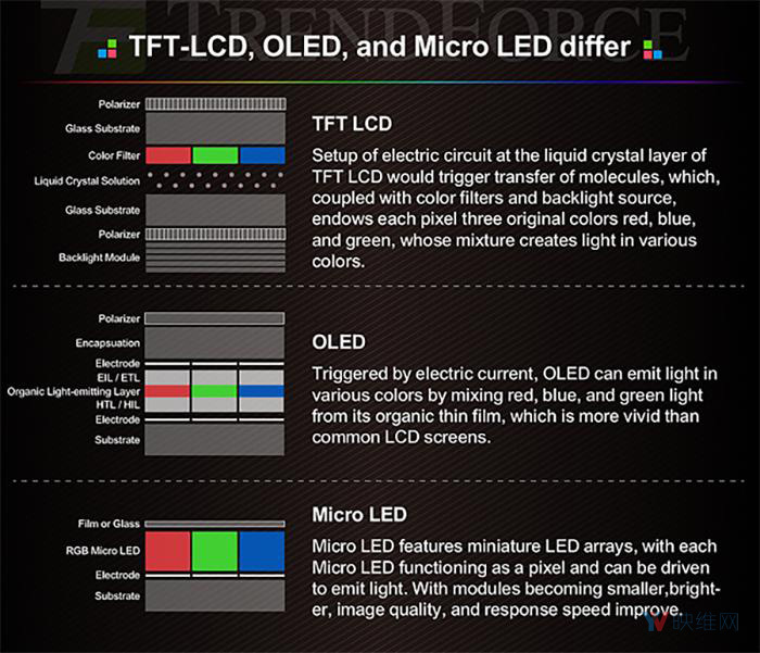 Micro LED與OLED類似,但它們使用的是氮化鎵無機(jī)材料(與傳統(tǒng)彩色LED類似)。事實(shí)上,它們跟普通彩色LED十分接近,只是體積縮小了很多很多而已。由于子像素具備發(fā)光性(它們可以像OLED一樣自行發(fā)光),所以它們不需要背光源或液晶層。但Micro LED同樣不需要偏振器,而且頂部只有一層薄玻璃層。它們比OLED更薄,而且比普通LCD要薄很多。